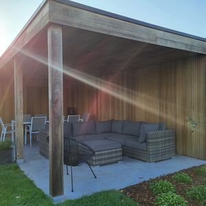Pour cette réalisation, un vaste lounge avec espace de rangement a été conçu, parfait pour se détendre dans le jardin. Le lounge offre suffisamment d’espace pour une grande table à manger ainsi qu’un canapé confortable, en faisant l’endroit idéal pour profiter de l’extérieur. La porte coulissante intégrée permet une transition fluide vers l’espace de rangement, où se trouve notamment un réfrigérateur – idéal pour toujours avoir une boisson fraîche à portée de main. La combinaison des dalles de terrasse grises et du bois chaud Thermo Ayous donne à l’ensemble un aspect moderne tout en restant naturel.