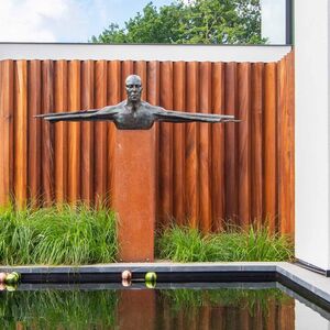 Quel superbe avant/après, n’est-ce pas ? La merveilleuse œuvre de l'artiste Dirk Lamote prend tout son sens avec une cloison de jardin Neighbours®. Le positionnement astucieux des poutres assure une intimité optimale. Neighbours® se distingue par son design épuré et apporte une touche unique dans le jardin.