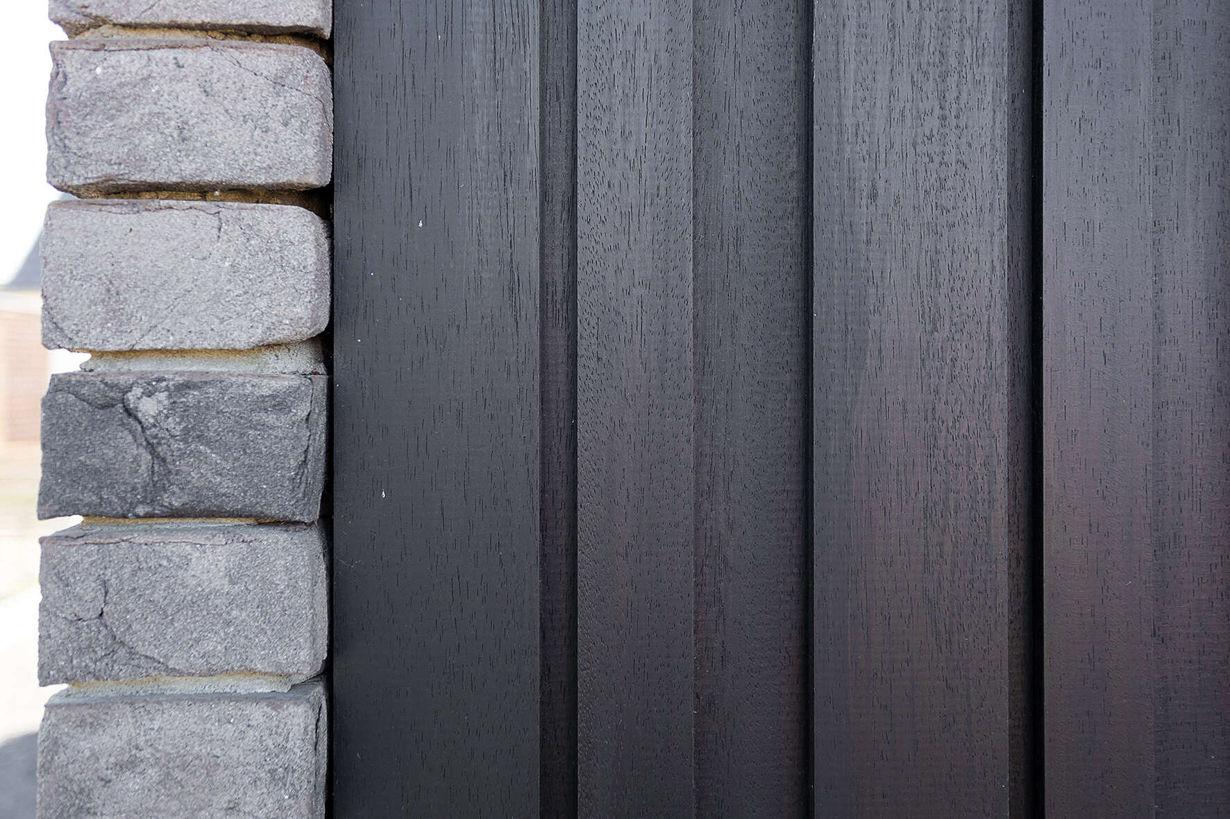 De houten gevelbekleding is vervaardigd met "h[age]®-90°" profielen, die strak en zwart zijn geolied. Deze keuze voor zwarte houten gevelbekleding voegt een moderne en elegante uitstraling toe aan het ontwerp, en zorgt voor een boeiend contrast met zowel de witte crépi als de verschillende bruintinten van de bakstenen.