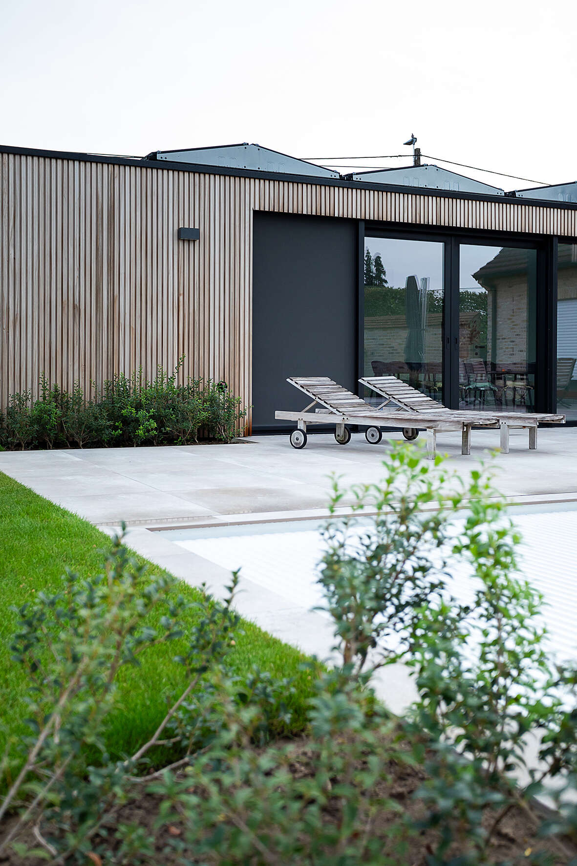 Deze aanbouw dient als buitenkeuken en poolhouse. Het project valt op door de harmonieuze combinatie van verschillende materialen, waaronder houten gevelbekleding in Thermo Ayous, donkere aluminium ramen en grijze terrastegels.